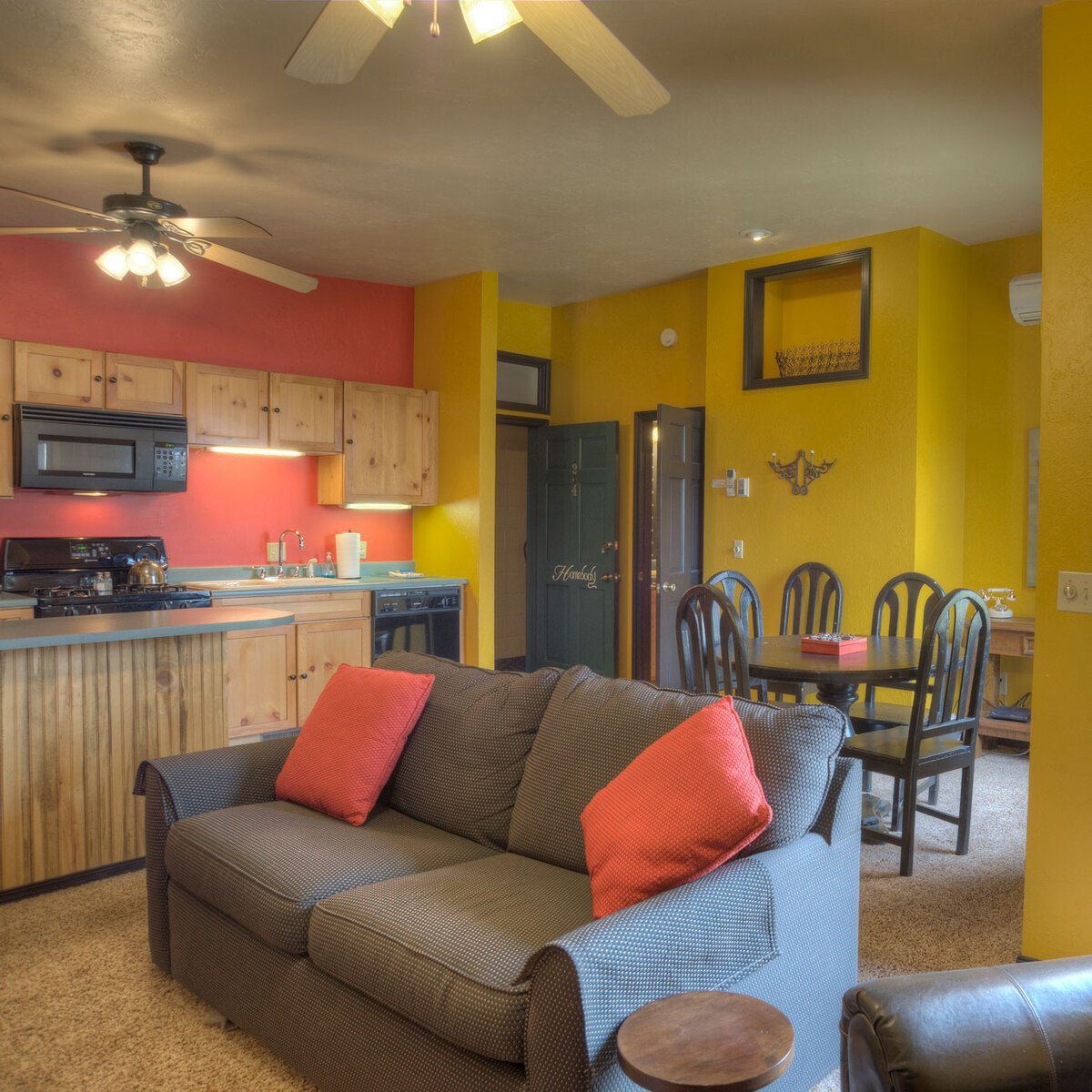 Here you'll enjoy a king size bed, ample closet and bathroom space (double sinks) and a full kitchen. The kitchen includes a full-size refrigerator, oven/stove, microwave, drip coffee maker, dishes and cookware. The sizable living area offers a sleeper sofa, and a dining table which seats 4.